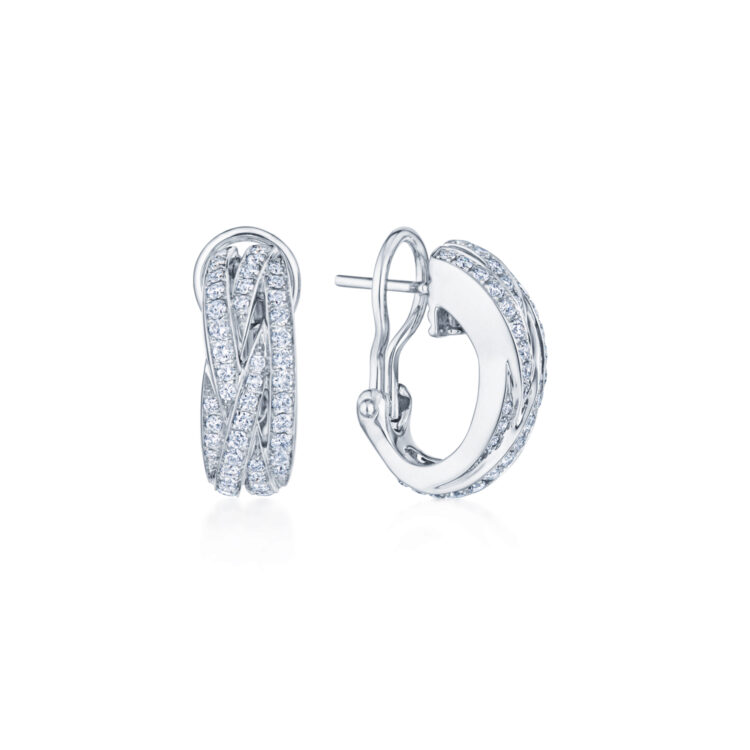 Dynamic huggie hoop earrings go day to night with ease. In 18K white gold with overlapping strands of diamonds, these are airy and lightweight. Kwiat artisans carefully engineer them with invisible hinges for easy on and off.